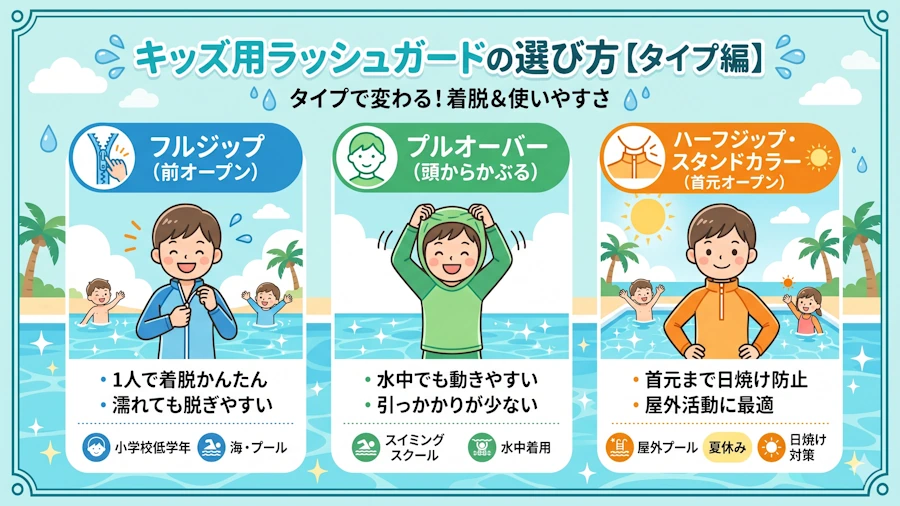 キッズ用ラッシュガードは、タイプ(フルジップ/プルオーバー)・UPF値・サイズ・ブランドの4つをチェックして選ぶのが大切なポイント。