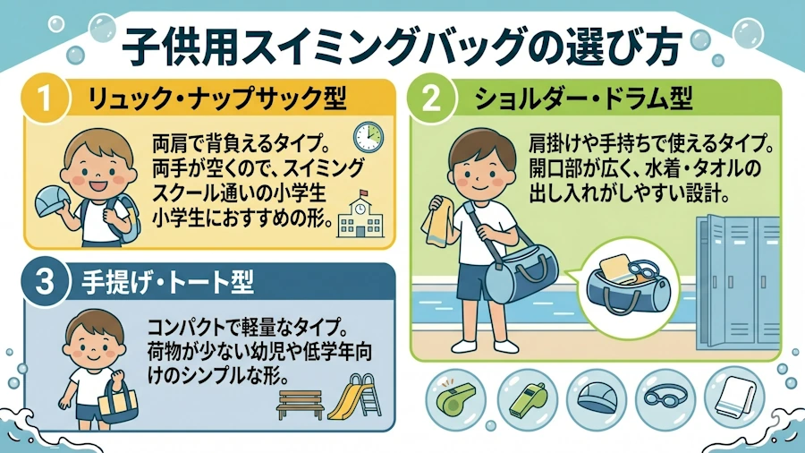 スイミングバッグは、持ち運びやすさを左右する「タイプ」がまず重要なポイント。