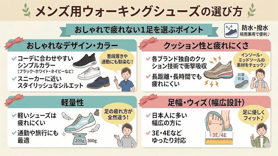おしゃれなメンズ用ウォーキングシューズは、デザインだけでなく、クッション性・軽量性・防水機能・幅広設計など、機能性との両立が大切です。