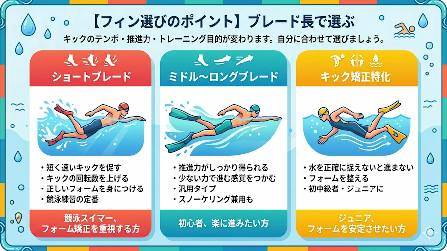 ブレード長によってキックのテンポ・推進力・トレーニング目的が変わるので、自分の練習内容に合わせて選びましょう。