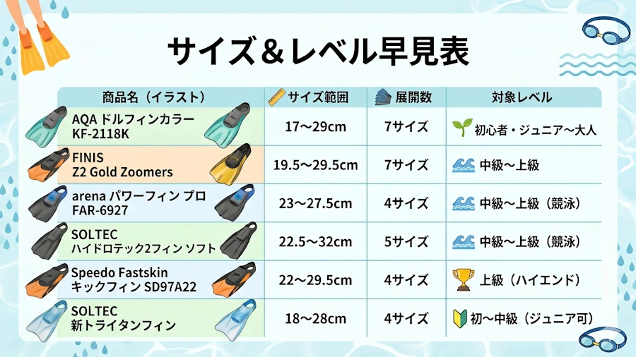 紹介した6モデルのサイズ展開と対象レベルをまとめた、フィン選びの早見表です。