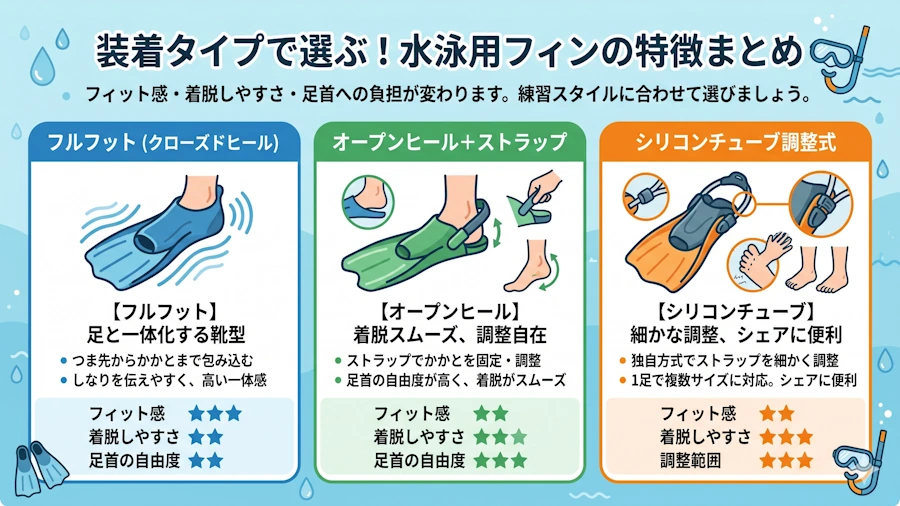 水泳用フィンは、装着方式によってフィット感・着脱しやすさ・足首への負担が変わるポイント。